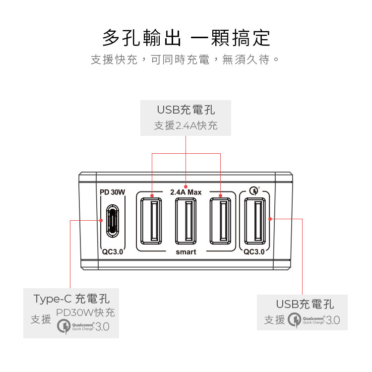 ■支援快充2.4A、PD30W、QC3.0 ■採用國際通用 AC100-240V,出差旅行好方便