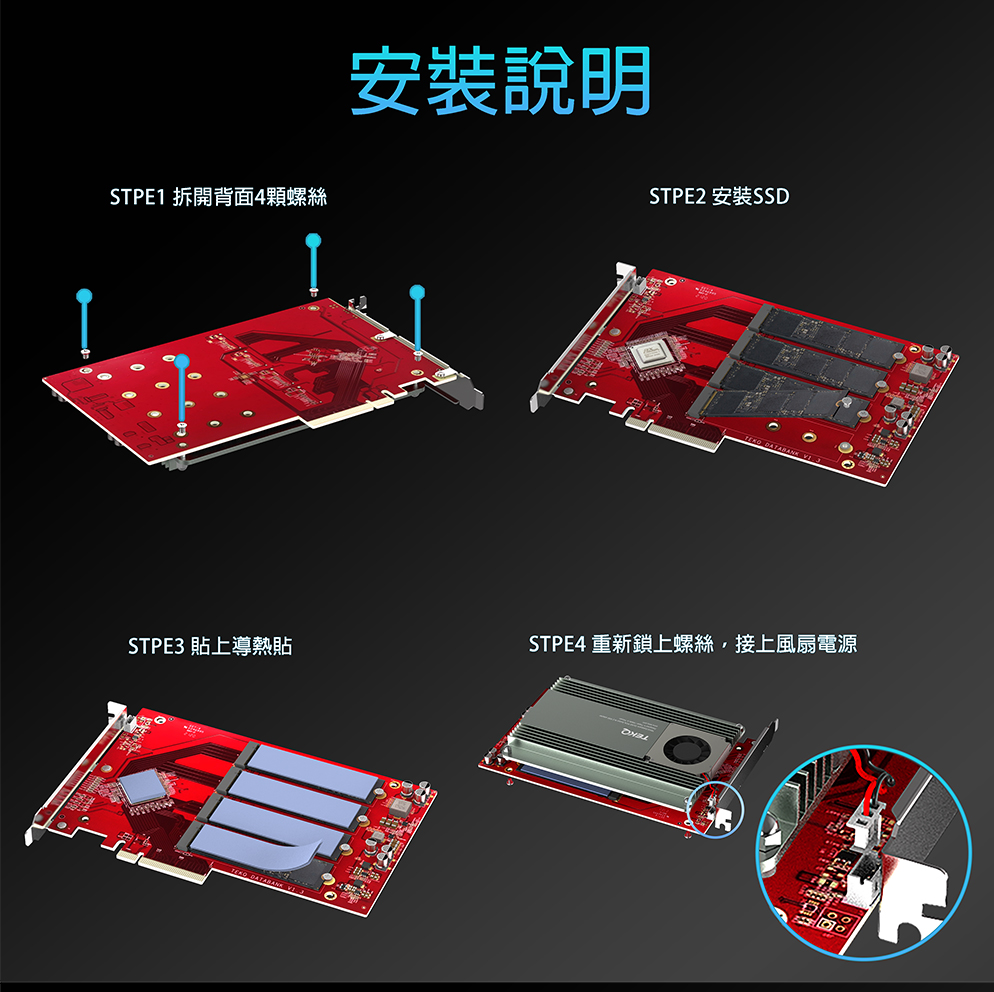 ■ 產品說明:本產品為M.2 2280 擴充板, 可加裝四條8TB規格的SSD