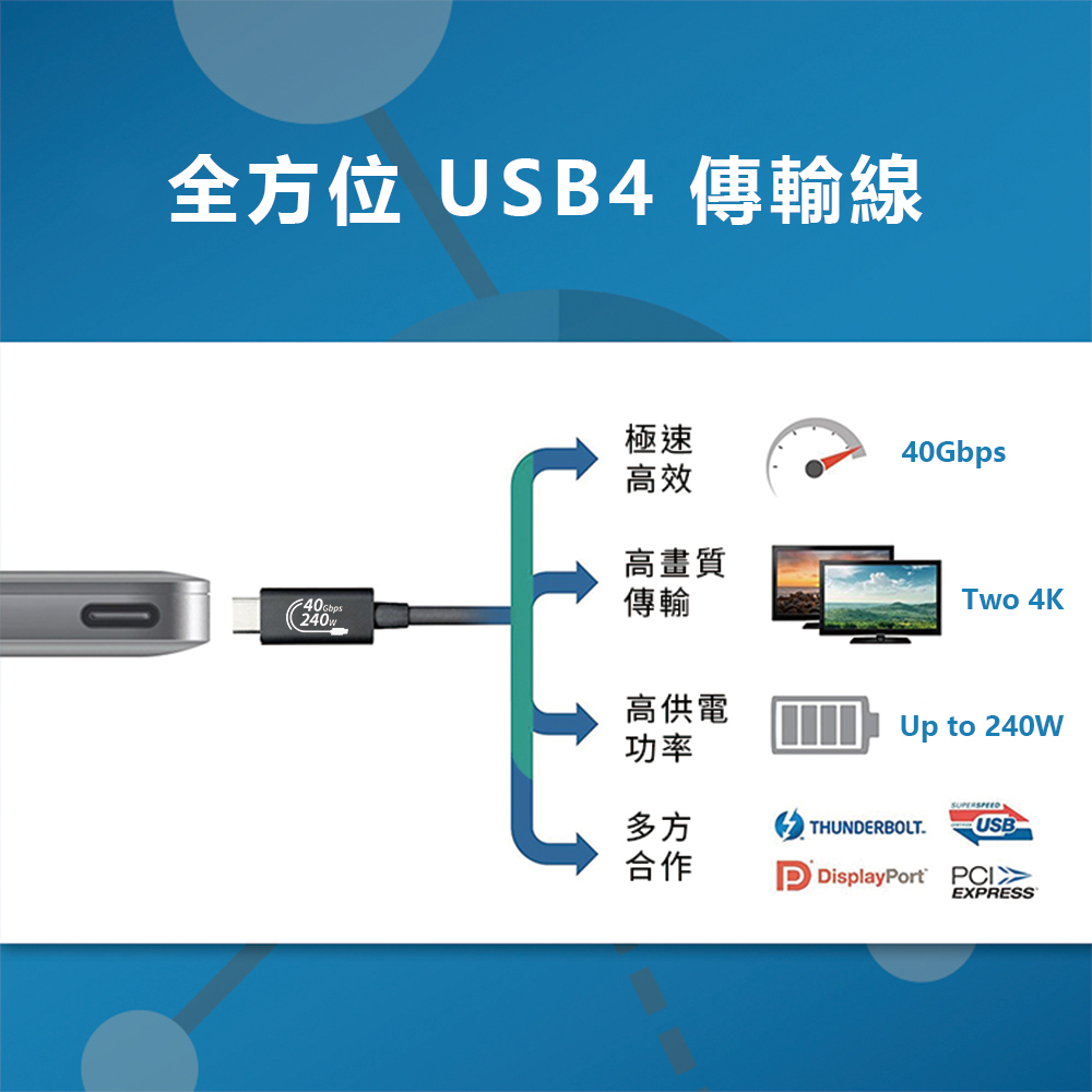 【TEKQ】USB-IF 認證 USB4 Gen3 高速傳輸線100cm 40Gpbs 240W 相容Thunderbolt 3/4