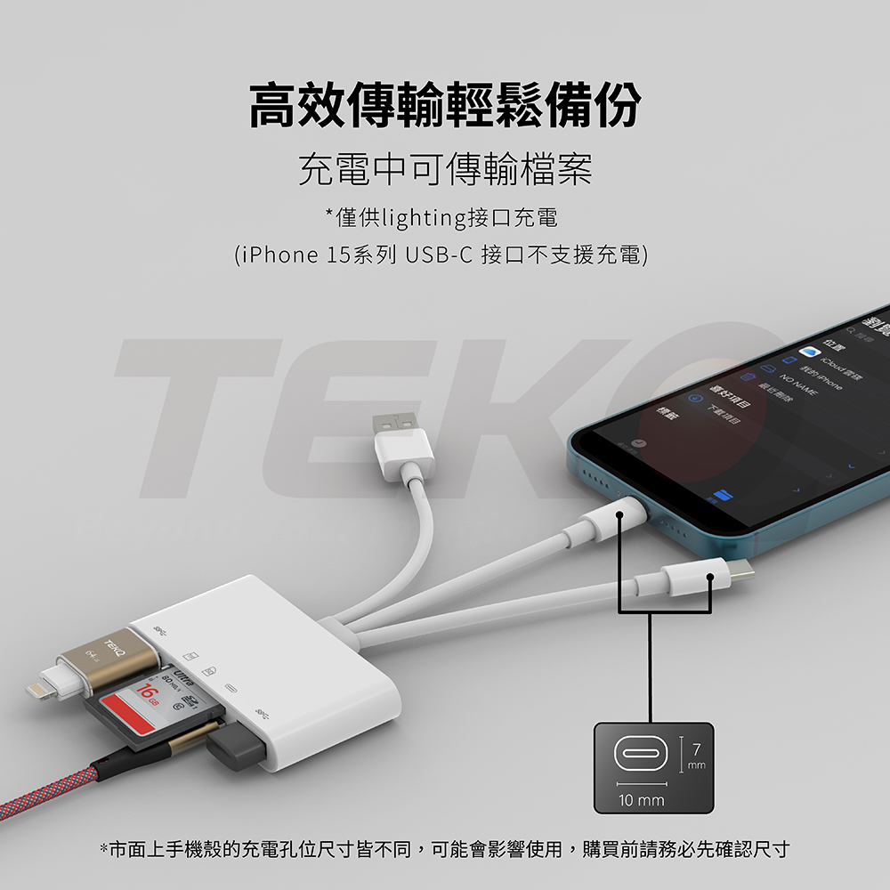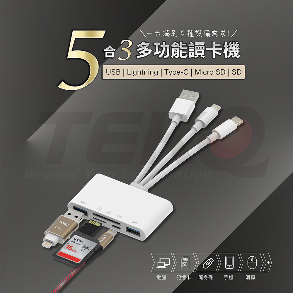 【TEKQ】三線五合一轉接頭 PD/雙USB/記憶卡多功能轉換-Lightning皆可使用