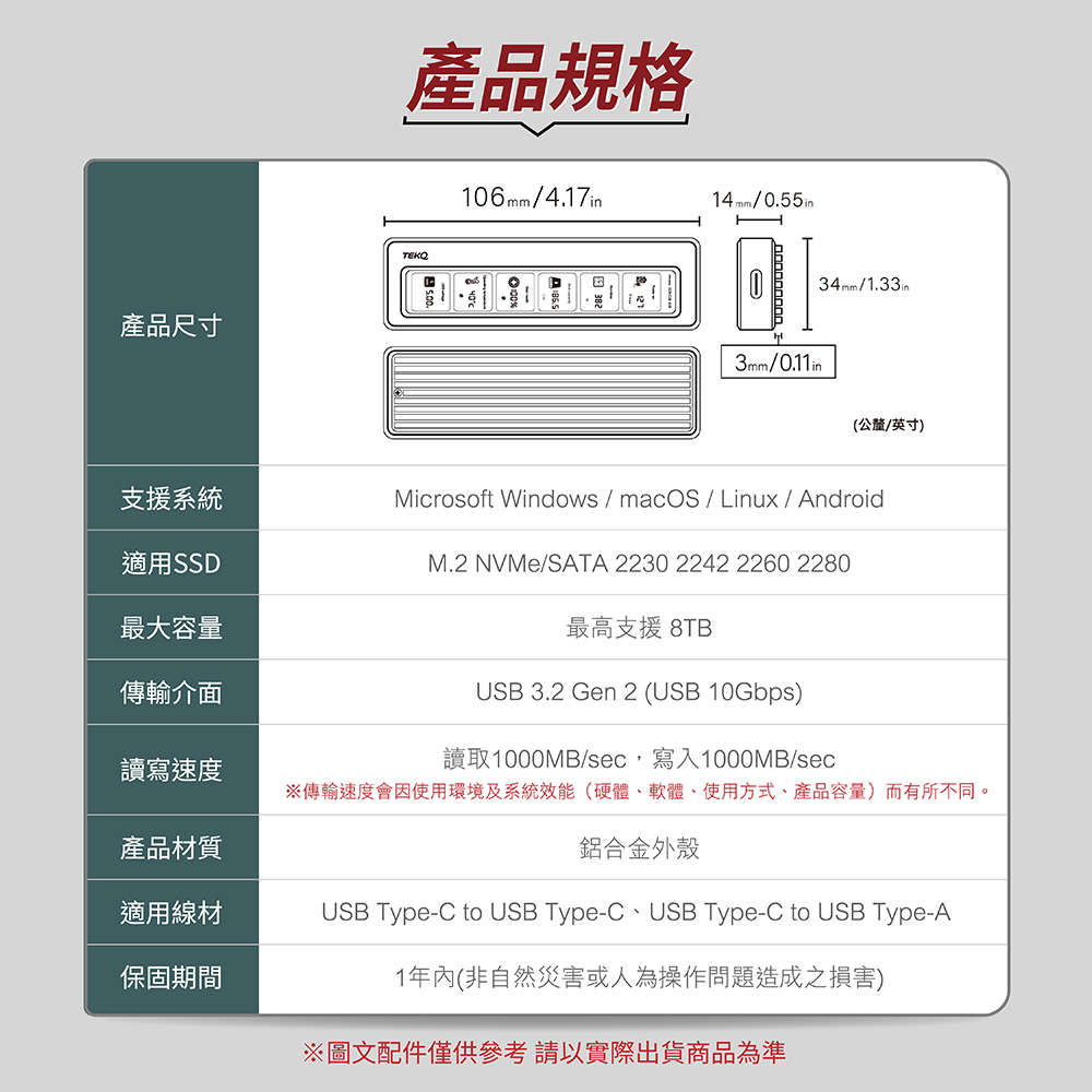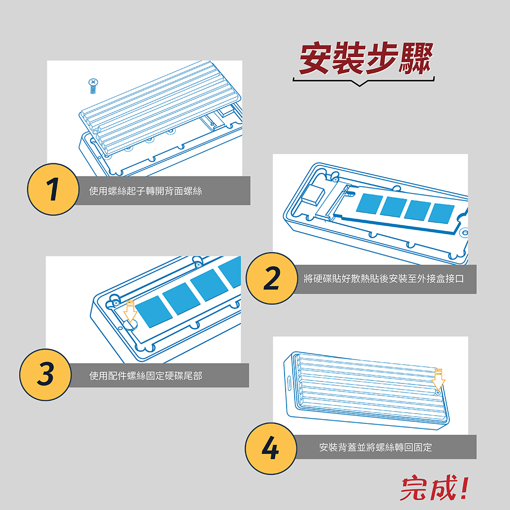 內容物 :商品本體、散熱片、傳輸線(C to C)、螺絲、螺絲起子、說明書
